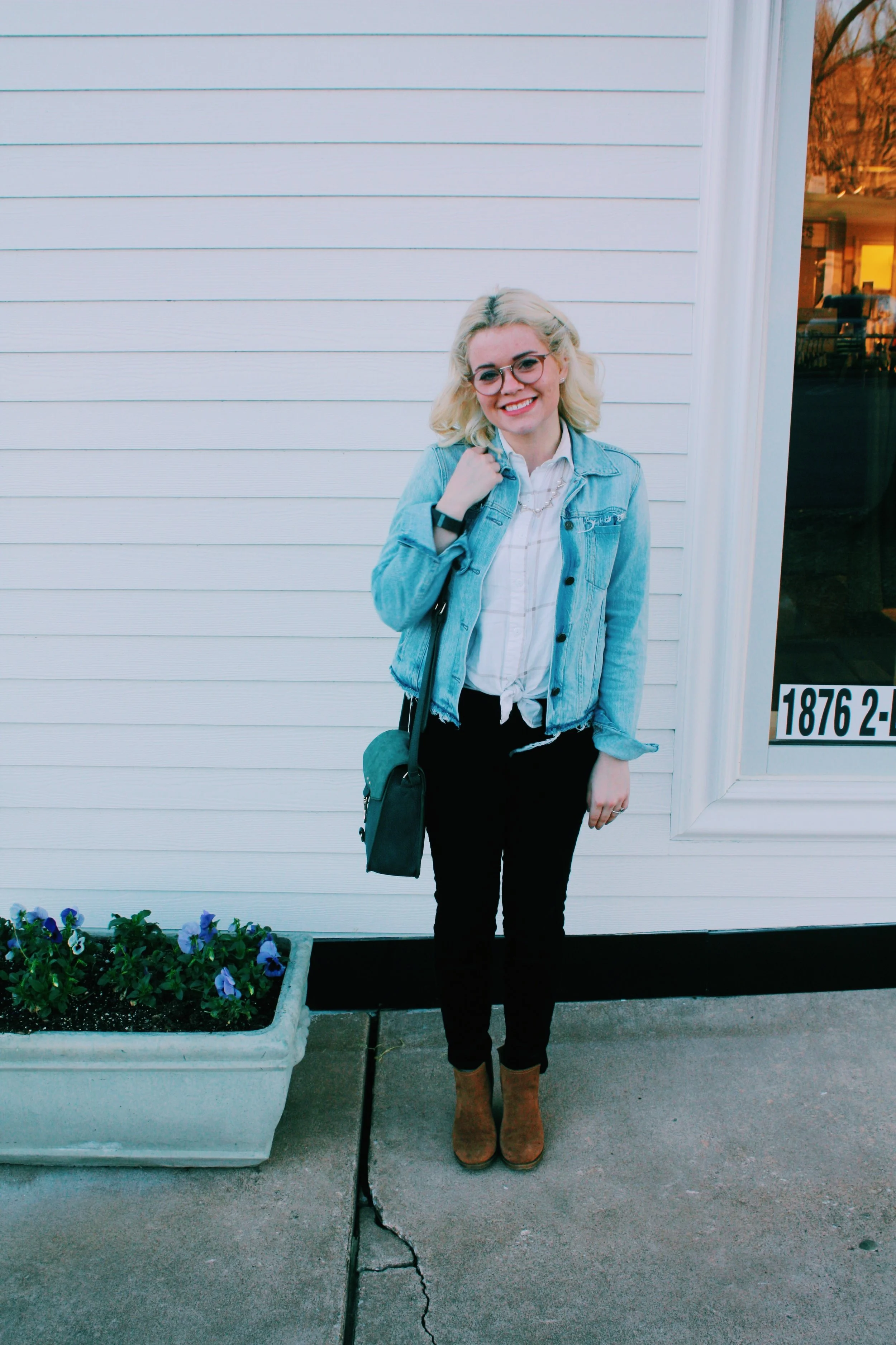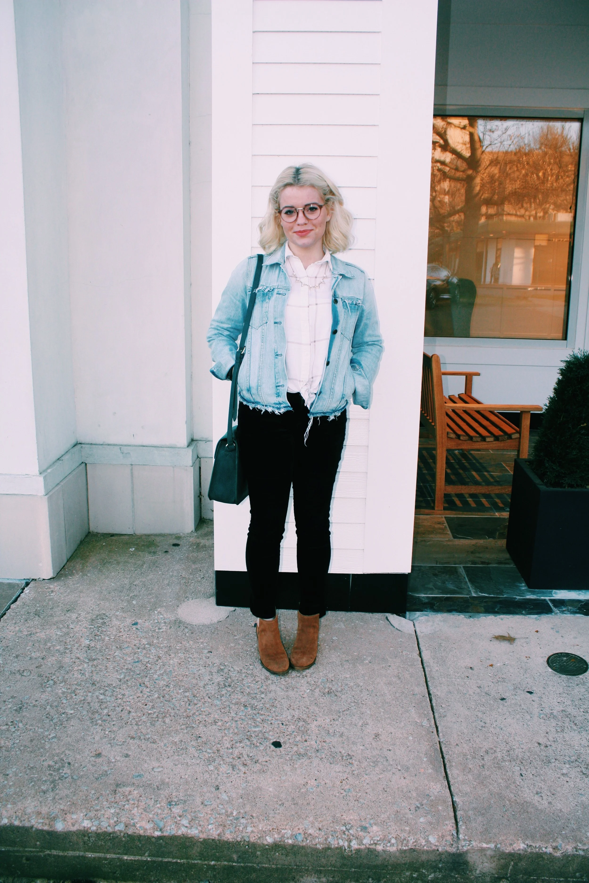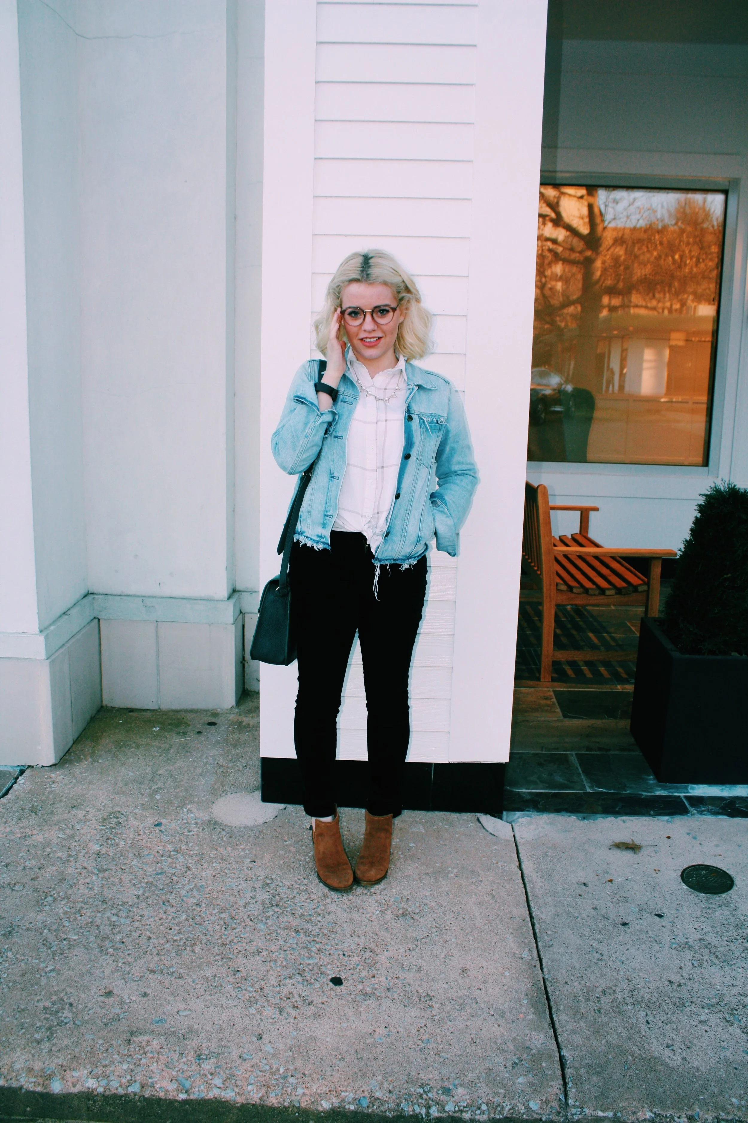 The weather has been so nice this week--such a great taste of spring with all the trees blooming and the sun shining!--but Friday night it was a little chilly, so I had to add another layer over my gridded blouse, which means it's time to break out the GAP denim. But honestly, EVERYDAY is a day for GAP denim.