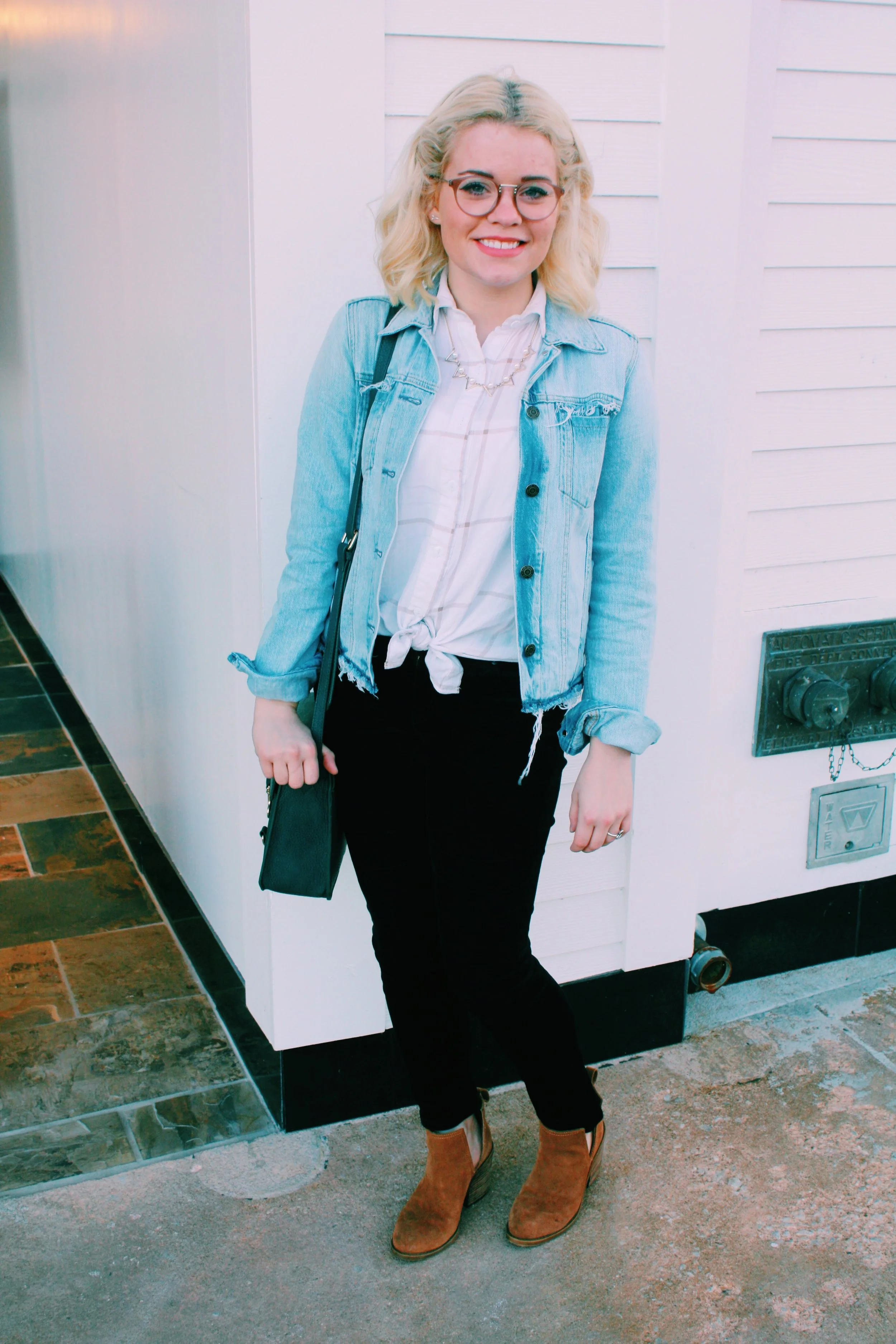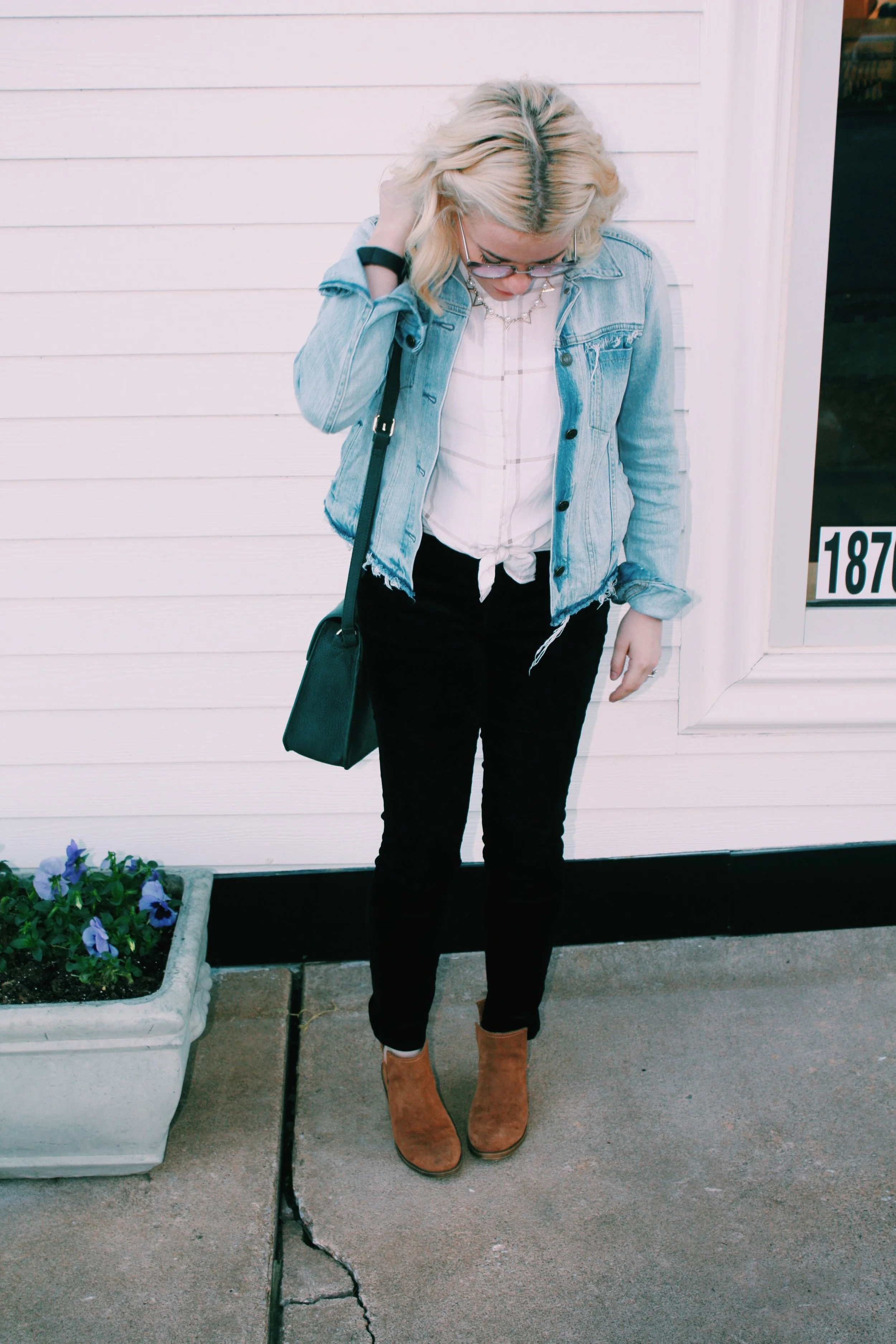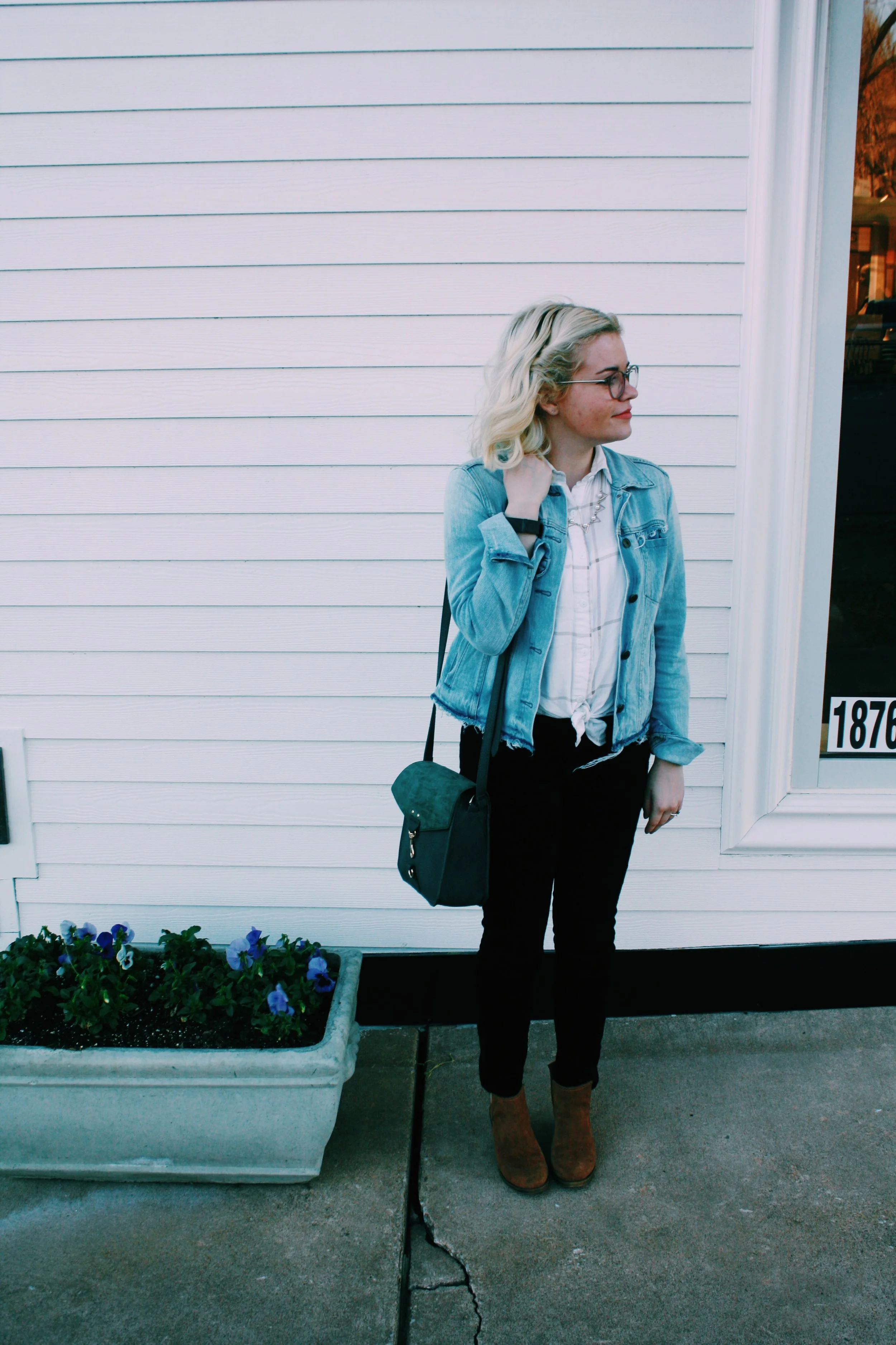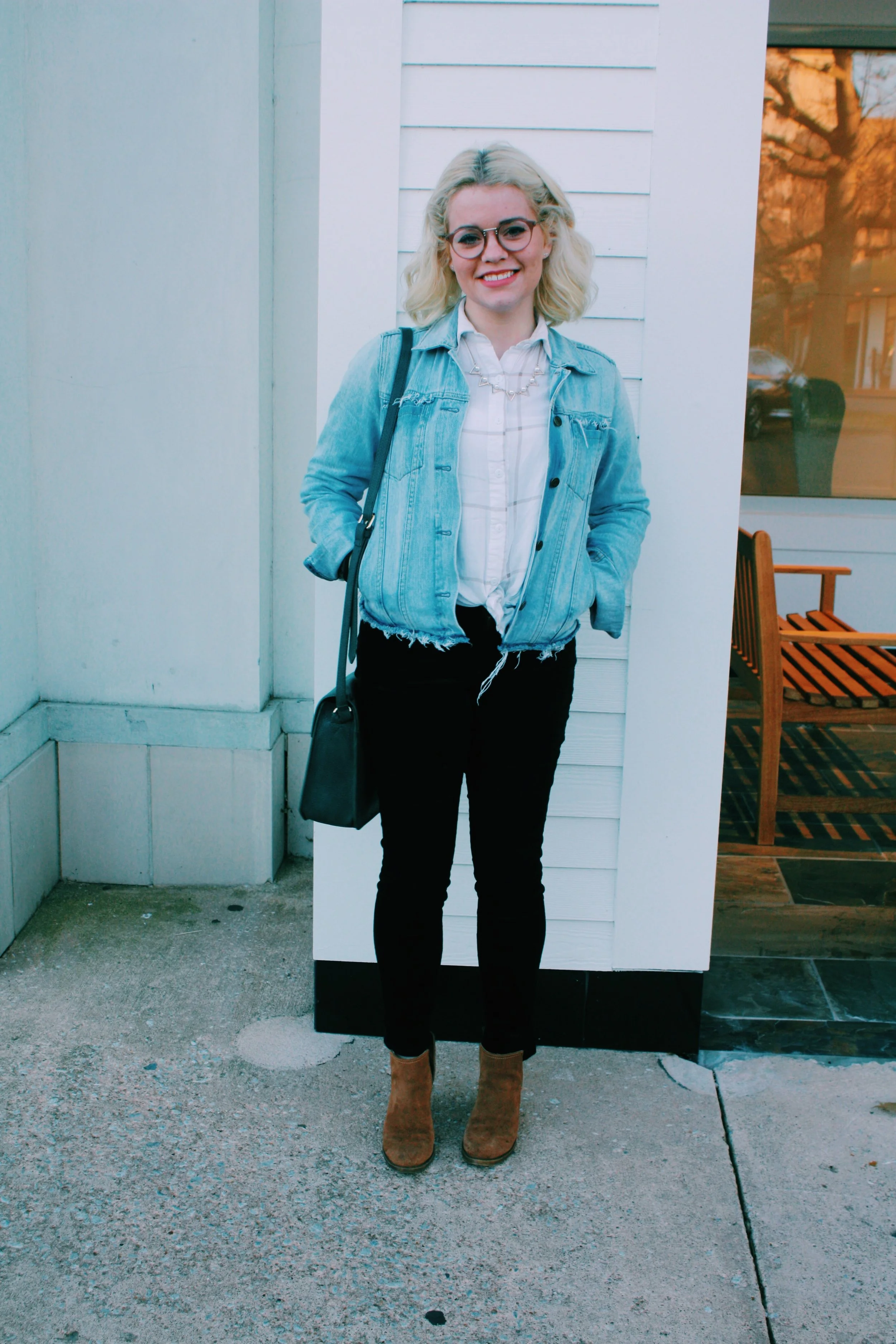 The weather has been so nice this week--such a great taste of spring with all the trees blooming and the sun shining!--but Friday night it was a little chilly, so I had to add another layer over my gridded blouse, which means it's time to break out the GAP denim. But honestly, EVERYDAY is a day for GAP denim.